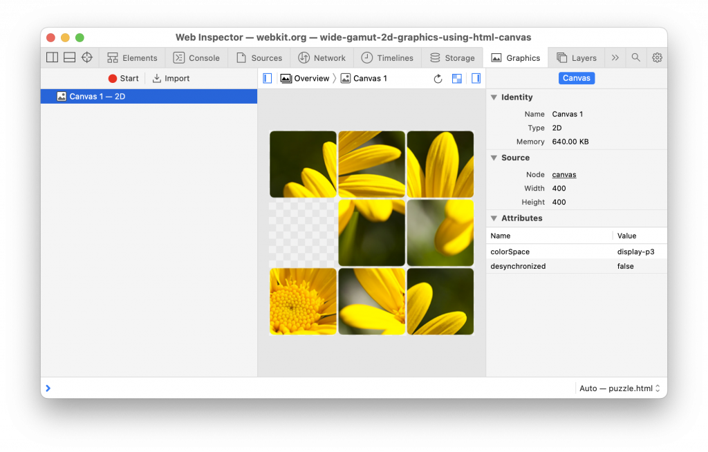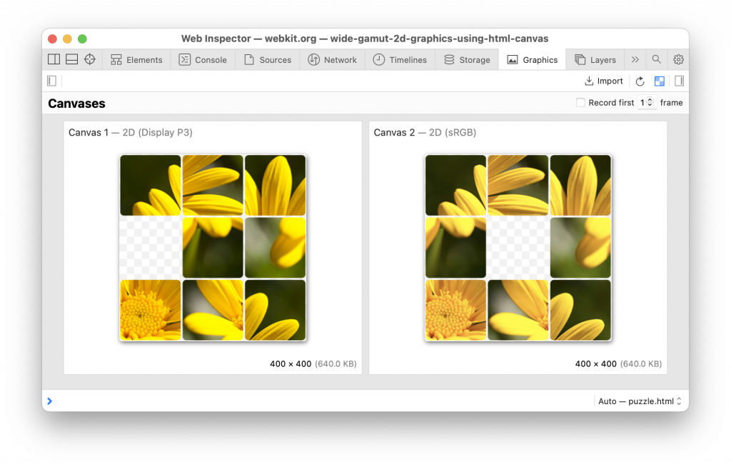 Web Inspector 现在也显示 canvas 的色彩空间信息,以帮助确保您的 canvas 后备存储处于预期的色彩空间中。