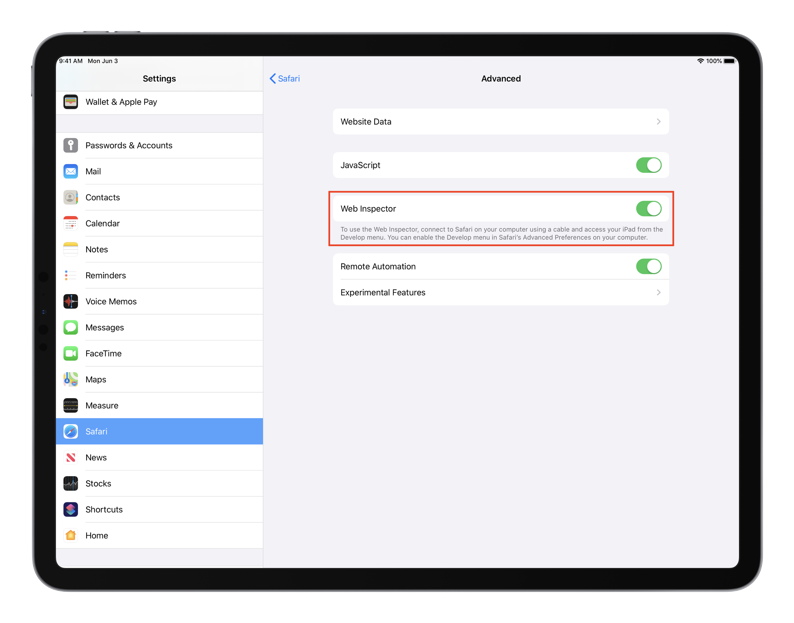 **注意**:为了使用远程检查,必须在已连接的 macOS 机器上启用 Web Inspector。