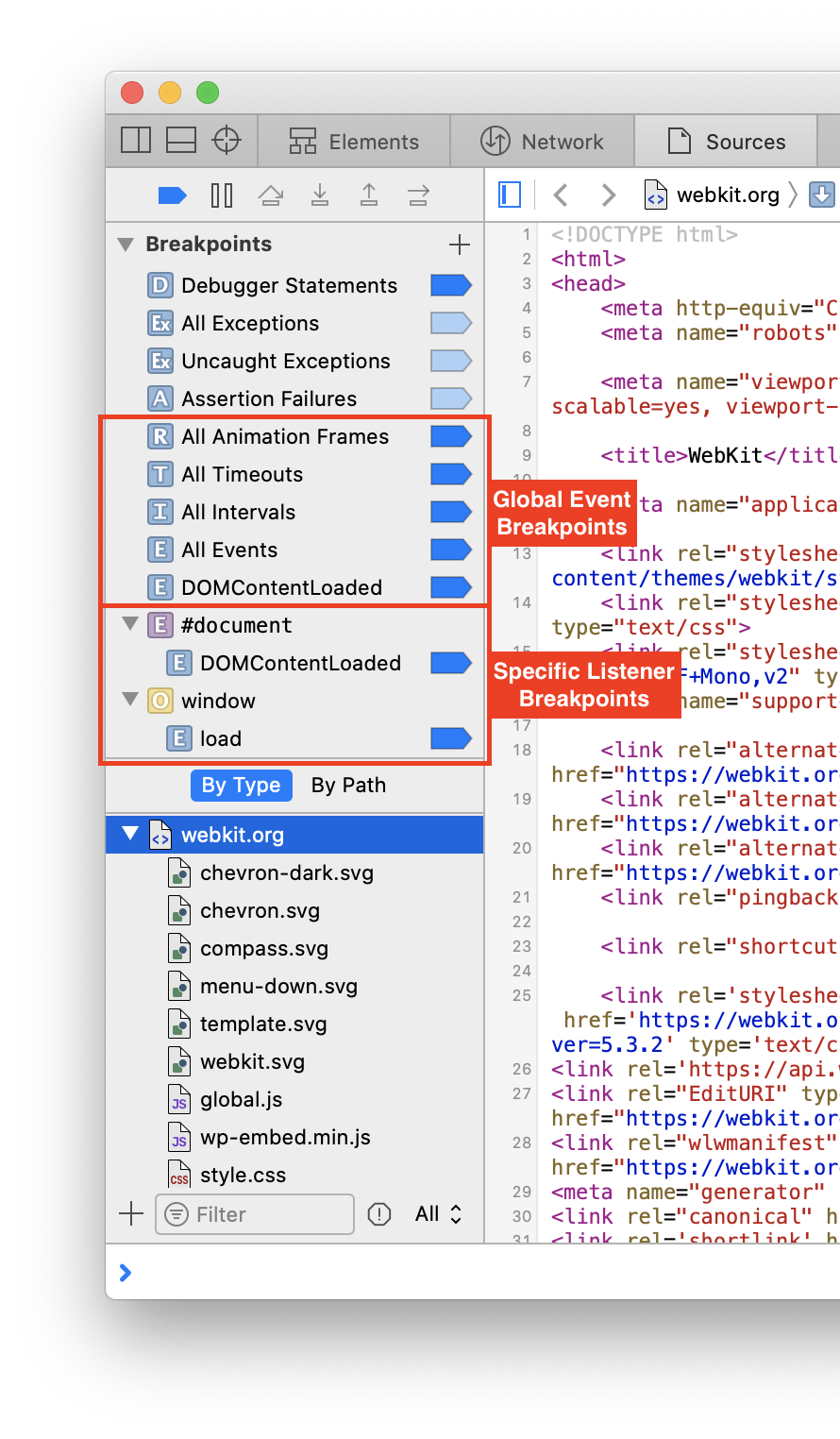 事件断点在调试 JavaScript 中的 DOM 交互时非常有用。事件断点有两种不同类型:全局事件断点和特定监听器断点。
