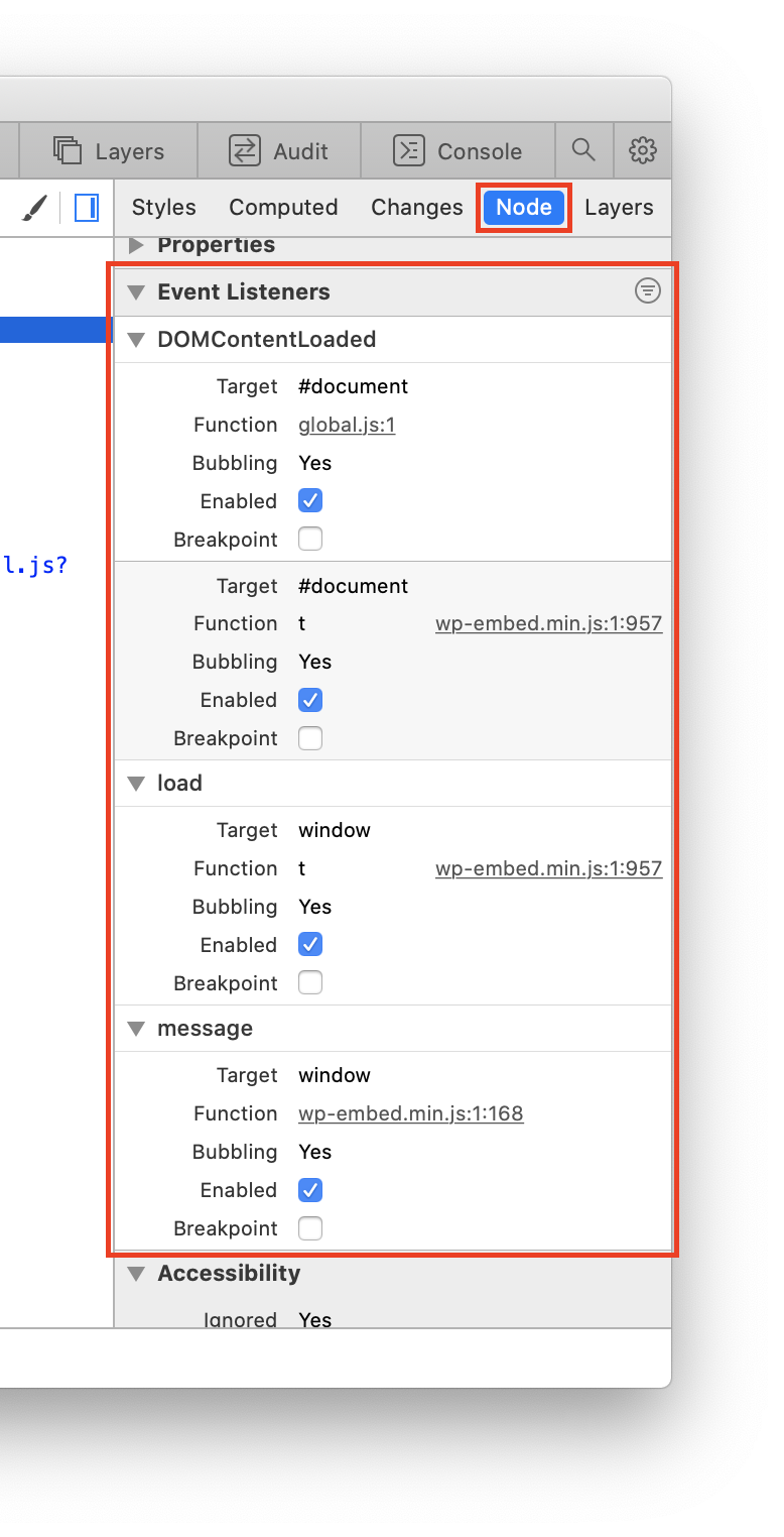useCapture选项的情况下(或者如果它被设置为false)添加时才会显示。 - 属性仅当该特定 DOM 事件监听器是通过 HTML 属性添加时才会显示。