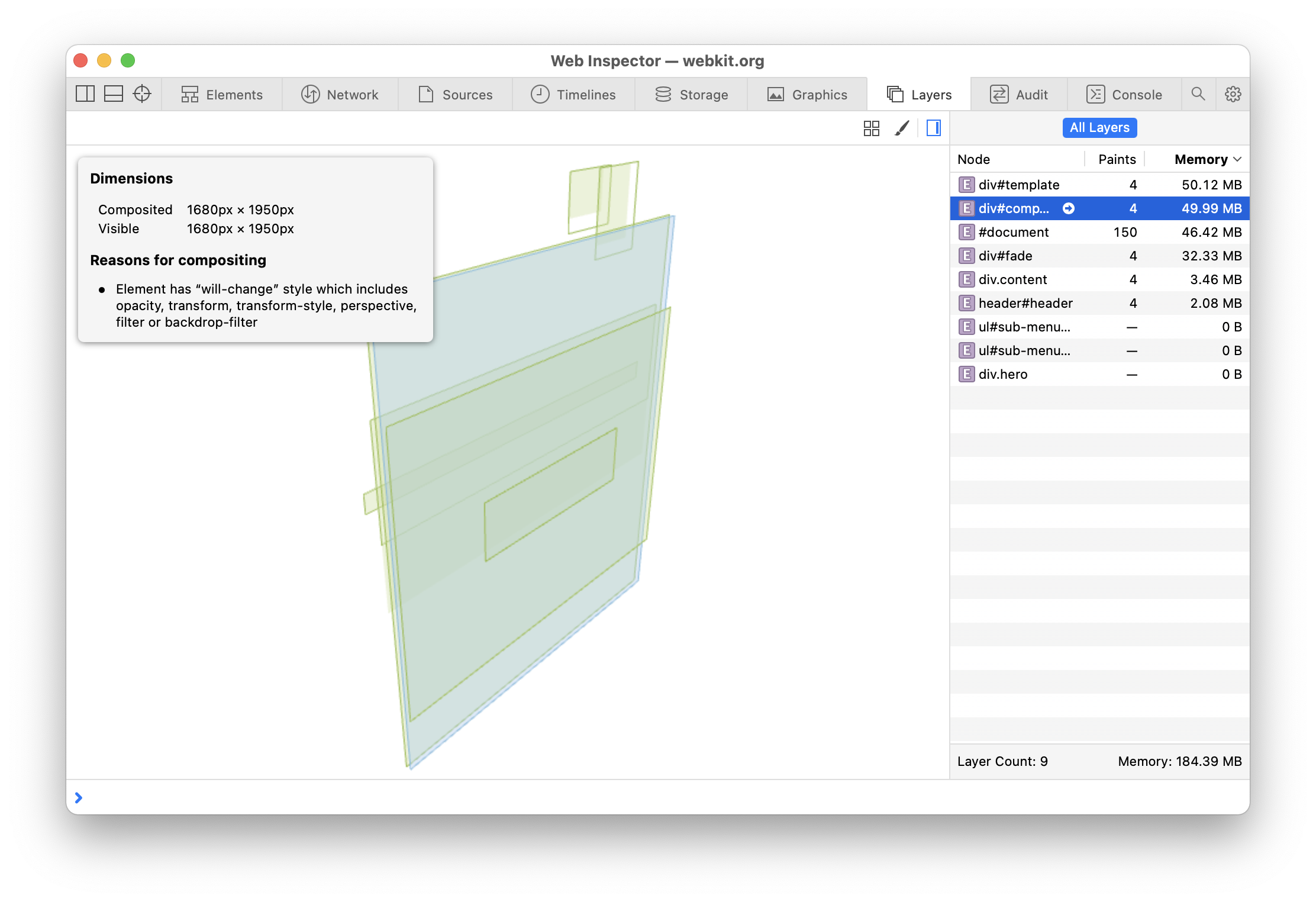 每个层的基本信息显示在详情侧边栏中的所有层面板中,例如累积绘制次数和内存开销。
