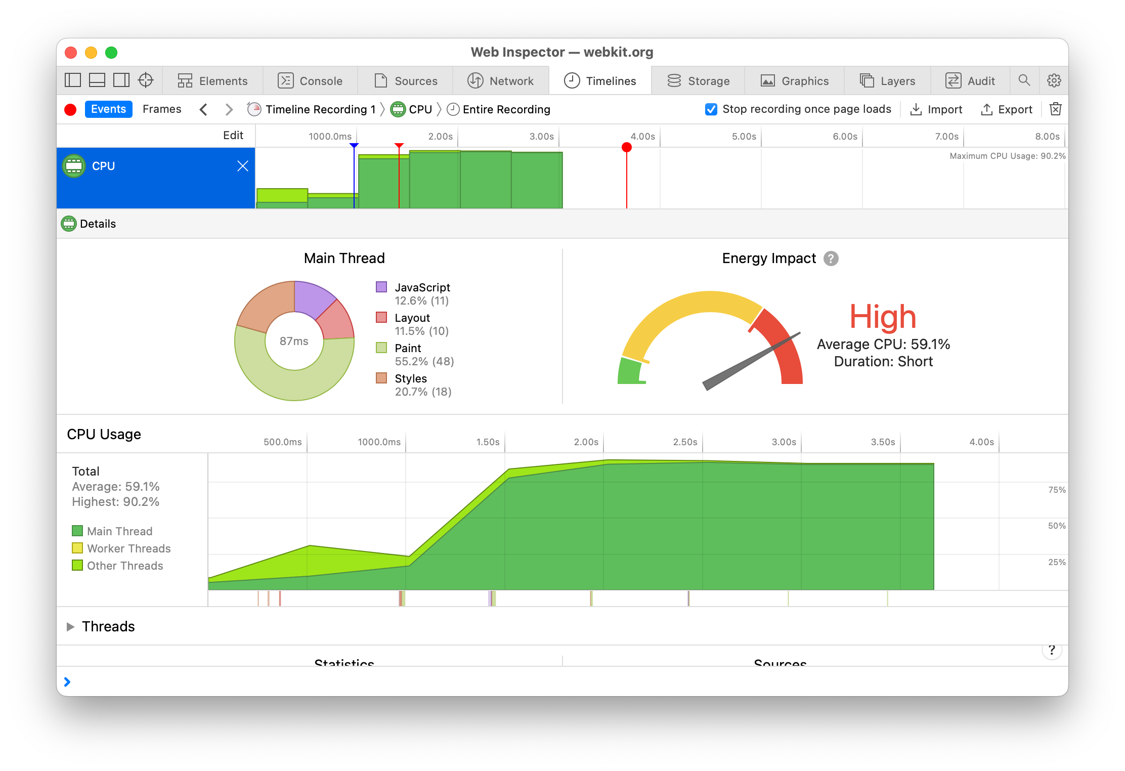 setTimeout等)组织,也可以作为时间无关的组合调用树。 - CPU时间轴绘制了时间轴录制期间与被检查页面相关的所有线程的CPU使用情况,并列出了时间轴录制期间执行的事件监听器、计时器、网络活动、脚本入口等数量和类型的额外统计信息。