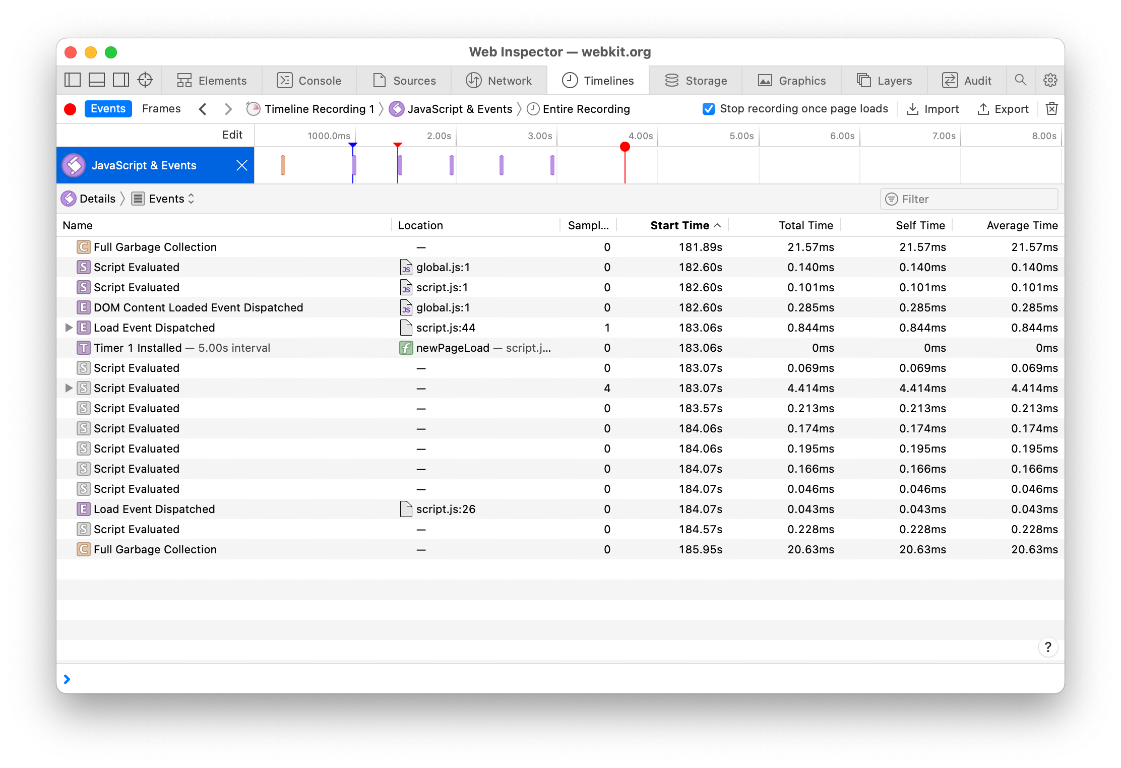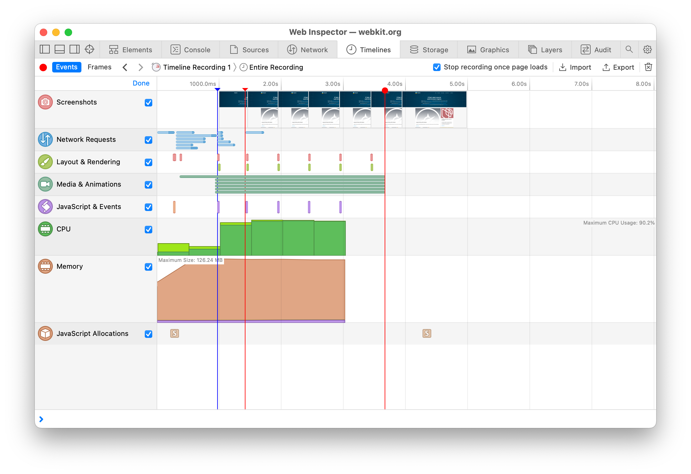 注意:JIT 去优化、断点、代码覆盖率、类型分析器以及其他调试功能在时间轴录制期间会暂时禁用,以最大限度地提高被检查页面的性能,从而衡量真实的性能。