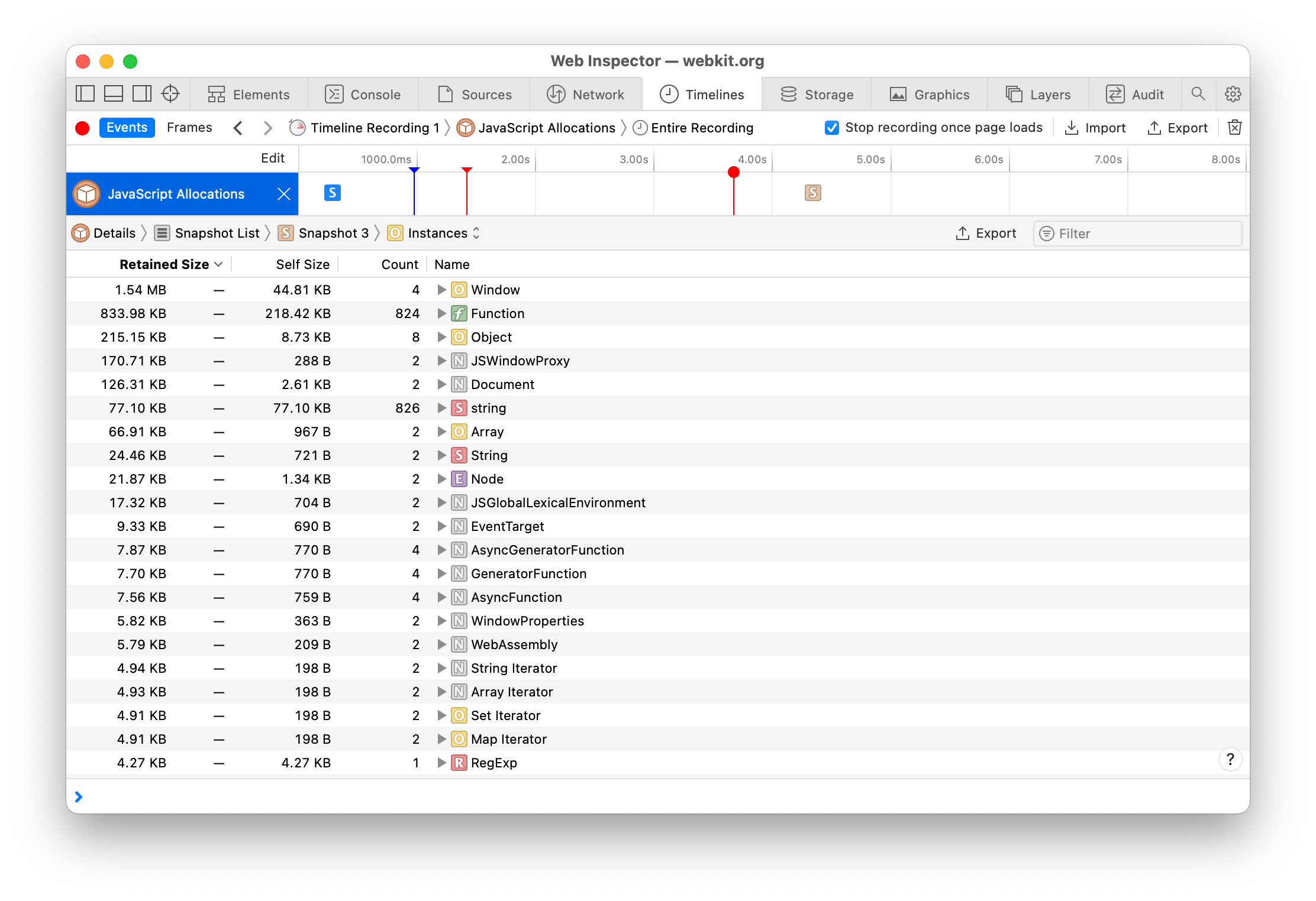 - JavaScript 分配时间轴列出了自网页检查器打开以来捕获的所有JavaScript 堆快照,并包含用于比较堆快照中对象的存在情况,以及可视化从任意给定对象到根全局对象的最短路径的工具。