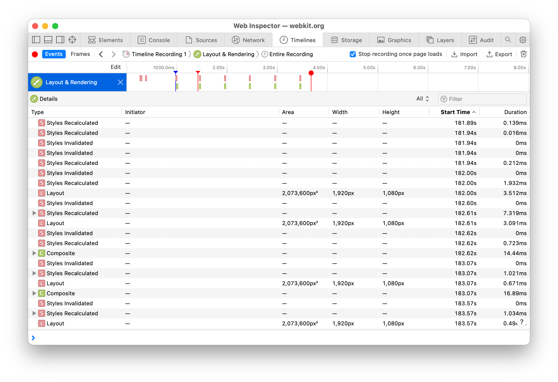 - 布局与渲染时间轴列出了时间轴录制期间发生的每次样式失效或重新计算、布局、合成和绘制,包括每次操作的大小信息以及指向触发它的JavaScript代码的链接(如果适用)。