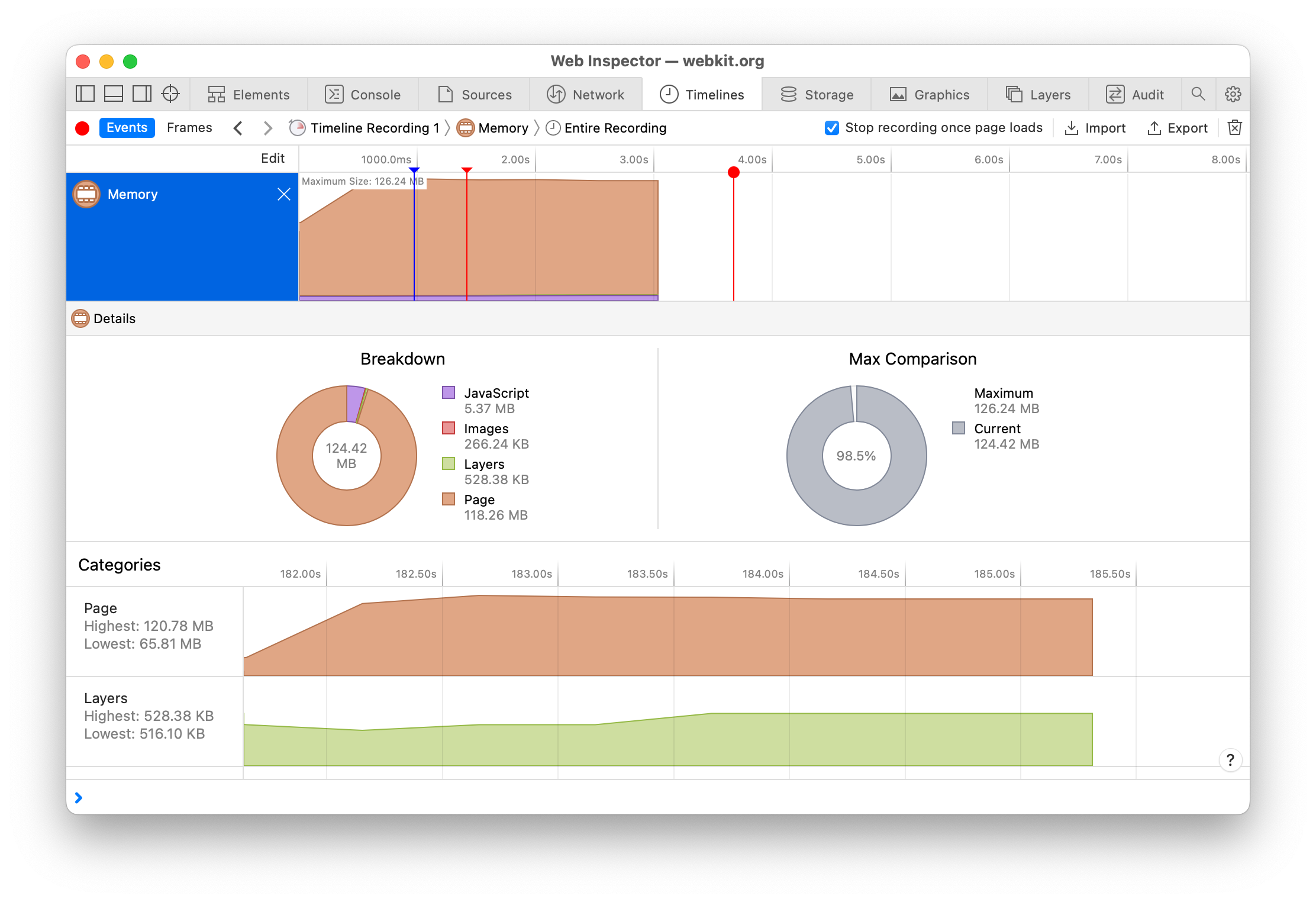 - 内存时间轴绘制了根据时间轴录制期间内存使用方式对被检查页面内存使用情况进行的细分。
