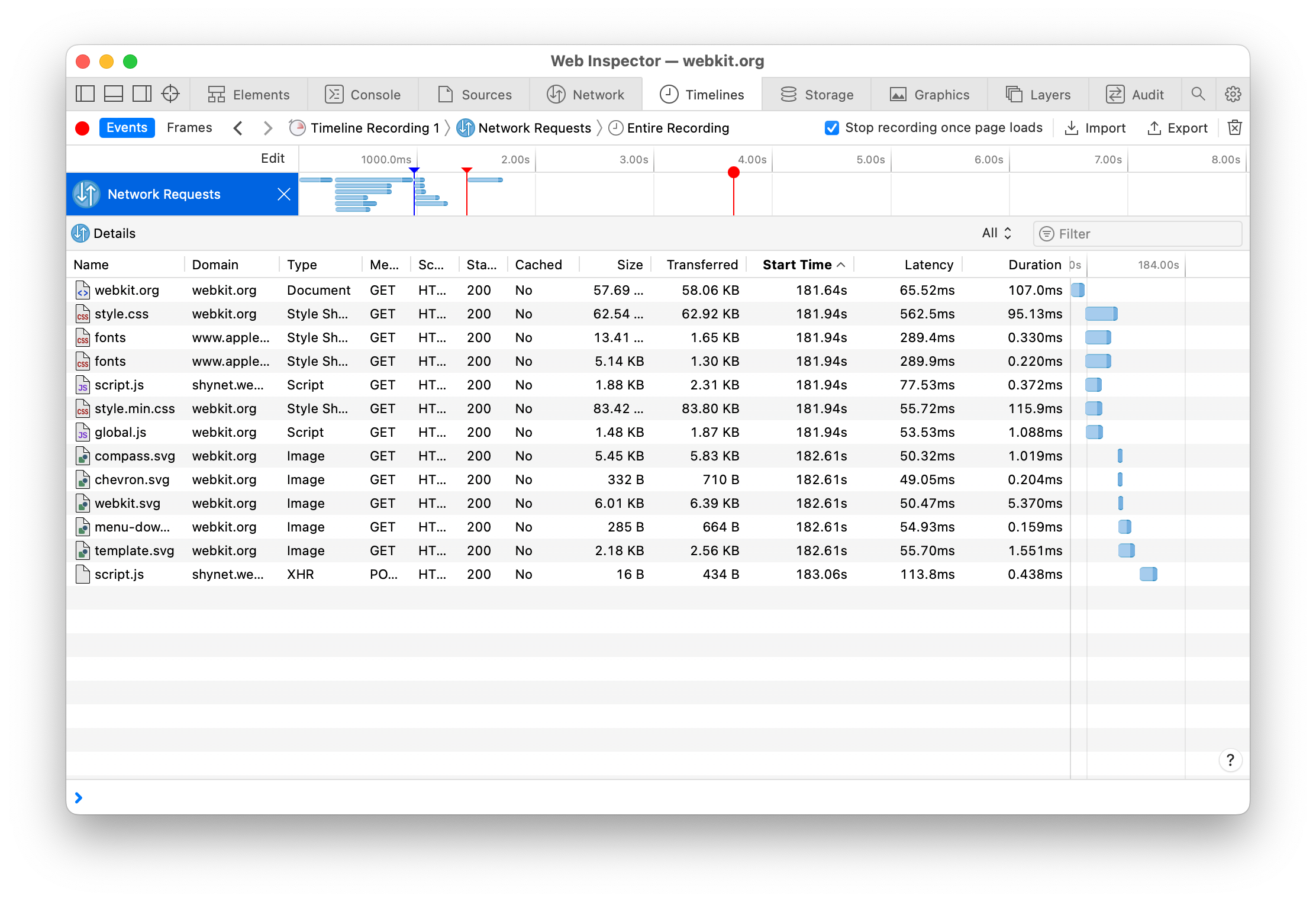 console.screenshot的所有图像。 - 网络请求时间轴与网络标签页类似,因为它列出了时间轴录制期间发生的所有网络活动。
