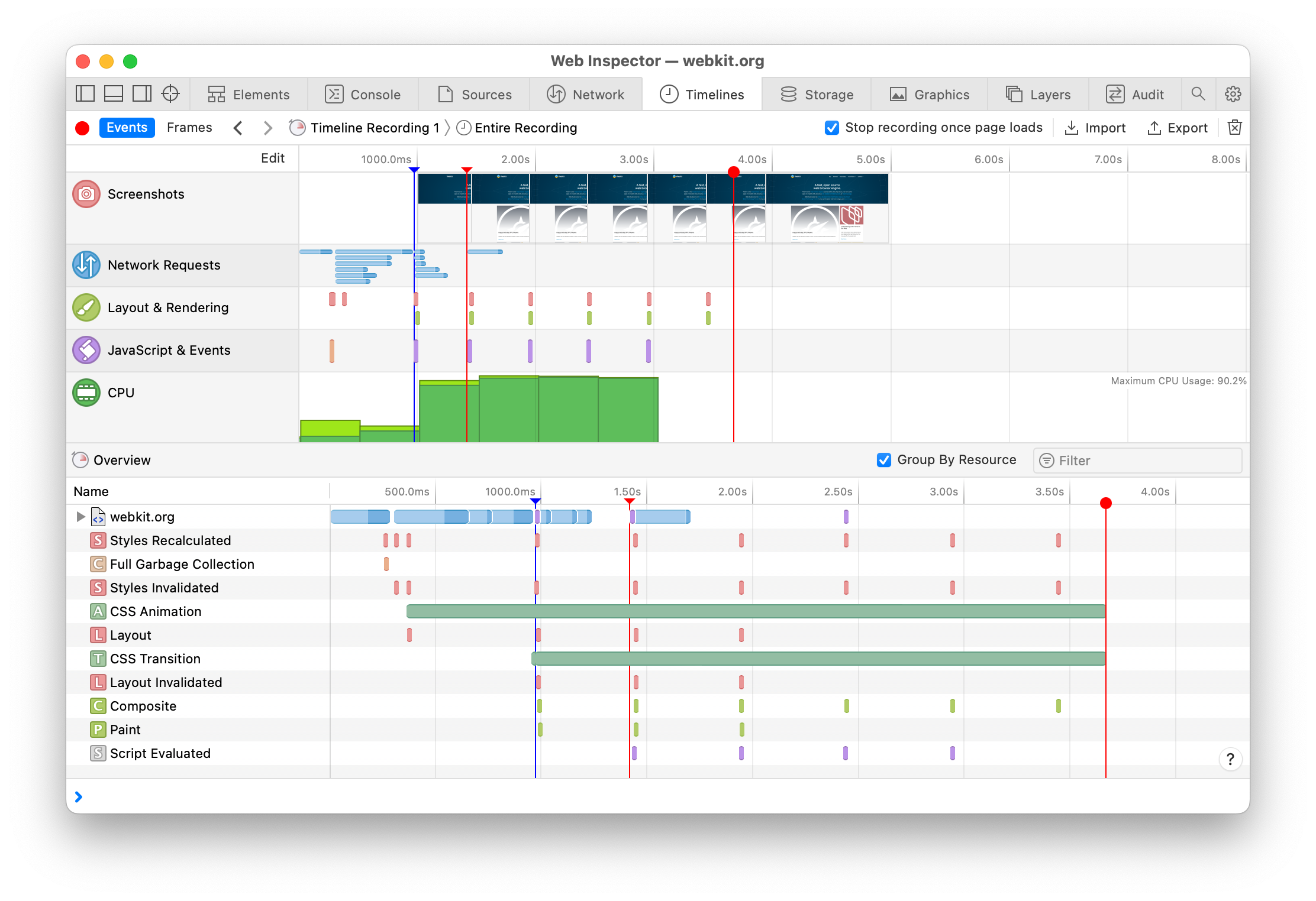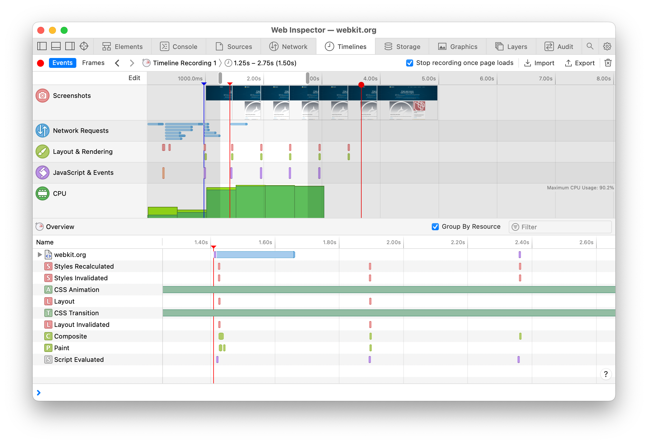 概览图的内容可以超出网页检查器窗口的边界。在概览图中垂直滚动将缩放可见时间范围,调整用于可视化每秒的像素数量比例。在概览图中任意位置点击并拖动将调整选定的时间范围,从而影响显示哪些记录,有效地过滤掉所有其他记录。