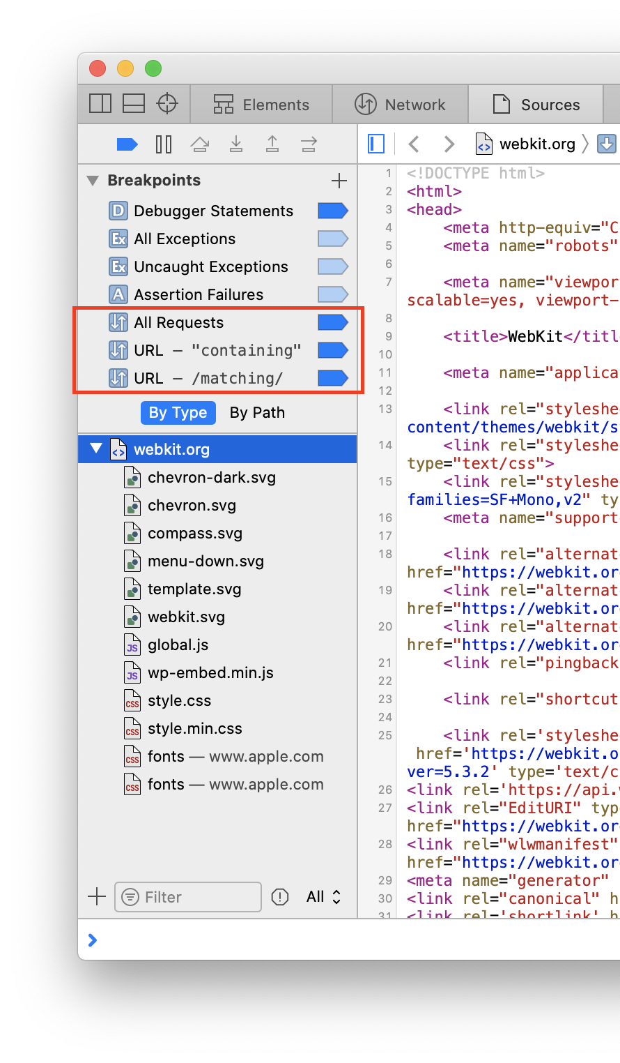 添加其中之一将使 Web 检查器在URL 断点被命中时播放系统蜂鸣声。